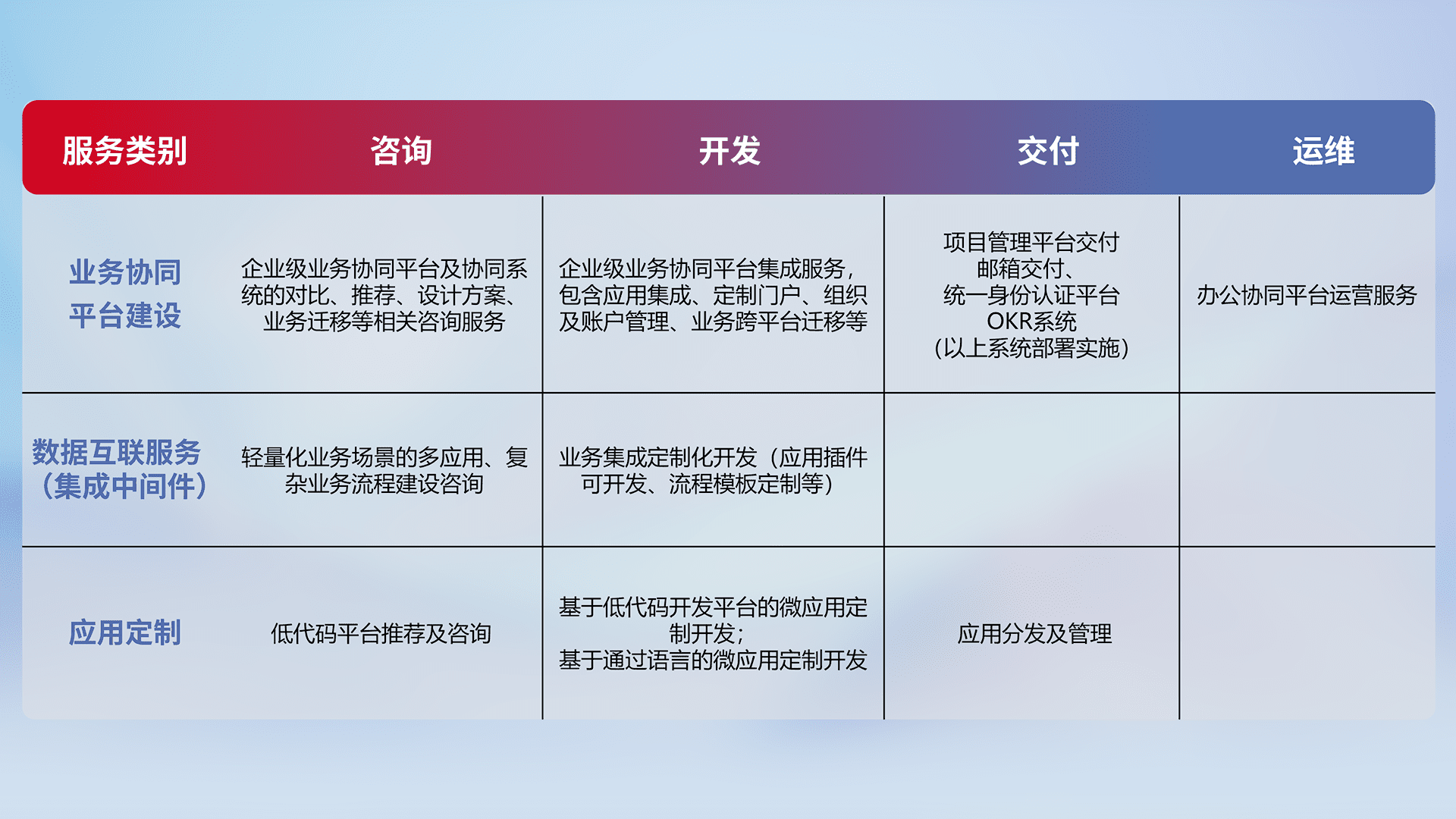 针对钉钉、、、、企微、、IDaas等平台级产品提供产品的规划、、方案、、、交付、、、定制化开发等服务,,实现如统一协同办公、、智能客户服务、、、、混合会议管理、、、智能数据查询、、、等业务场景,,,,实现数字化转型。。